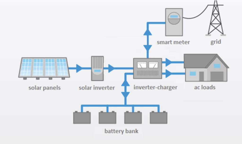 Ένα πλήρες φωτοβολταϊκό σύστημα για ενεργειακό συμψηφισμό αποτελείται από τα φωτοβολταϊκά πλαίσια που εγκαθίστανται σε ειδικές βάσεις. Αποτελείται, επίσης, από τον αντιστροφέα τάσης και τον μετρητή ενέργειας της παραγόμενης ενέργειας. Όταν η ηλιακή ακτινοβολία πέσει πάνω στο φωτοβολταϊκό πάνελ δημιουργείται ηλεκτρική ενέργεια. Η ηλεκτρική ενέργεια οδηγείται στον αντιστροφέα τάσης προκειμένου να μετατραπεί το συνεχές ρεύμα που έχει παραχθεί σε εναλλασσόμενο. Εν συνεχεία, το εναλλασσόμενο ρεύμα περνάει από τον μετρητή ενέργειας και από το συμβατικό ρολόι που υπάρχει σε κάθε ακίνητο προτού καταναλωθεί ή επιστραφεί στο δίκτυο. Με αυτόν τον τρόπο ολοκληρώνεται η διαδικασία αυτοπαραγωγής, όλου ή ενός μέρους, του ηλεκτρικού ρεύματος που απαιτείται για τη λειτουργία μίας κατοικίας ή ενός επαγγελματικού χώρου.